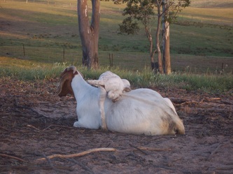The Cadenza stud does are supervised during the kidding period by bringing them to smaller sheltered paddocks close to the home area. This makes it easier to assist any does that require help during kidding (a very rare event) and also to protect newborn kids from the worst of any severe weather conditions. The does are fed high quality hay or feed cubes for two weeks prior to kidding, and then some supplementary feed during the high milking period. It is important that the does do not lose too much weight during this period as milk production will be affected and the does will need too long to return to a rising plane of nutrition for joining.