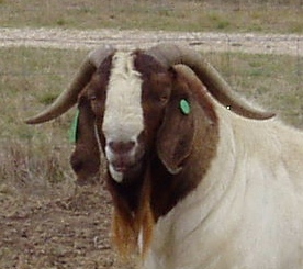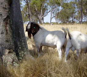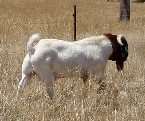 Bart is the biggest and most robust of all our bucks. He is sired by Meggs, out of a really lovely correct Terraweena doe from the Karbo Lawrence bloodline. Absolutely correct in legs and feet and a great sire of big, tough, and hardy meat kids. His kids grow faster than any of the other bloodlines. SEMEN IS NOW AVAILABLE